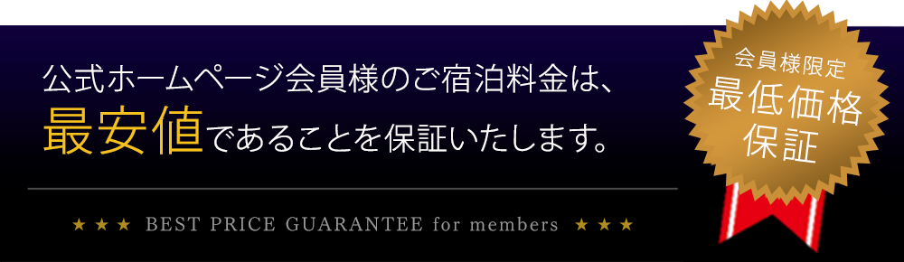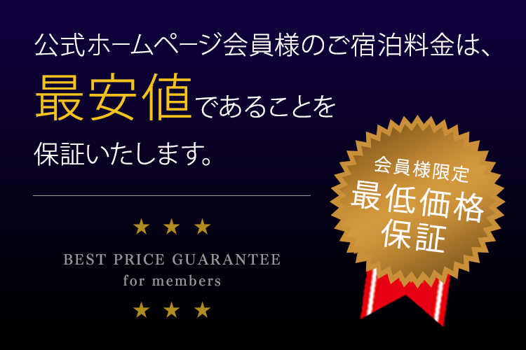 ご予約の時点で、会員様のご宿泊料金が他社ウェブサイトと比較して最もお得であることをお約束するものです。